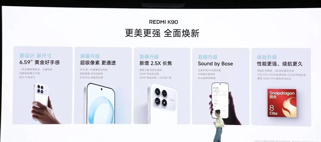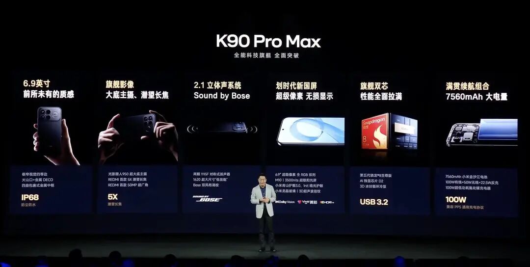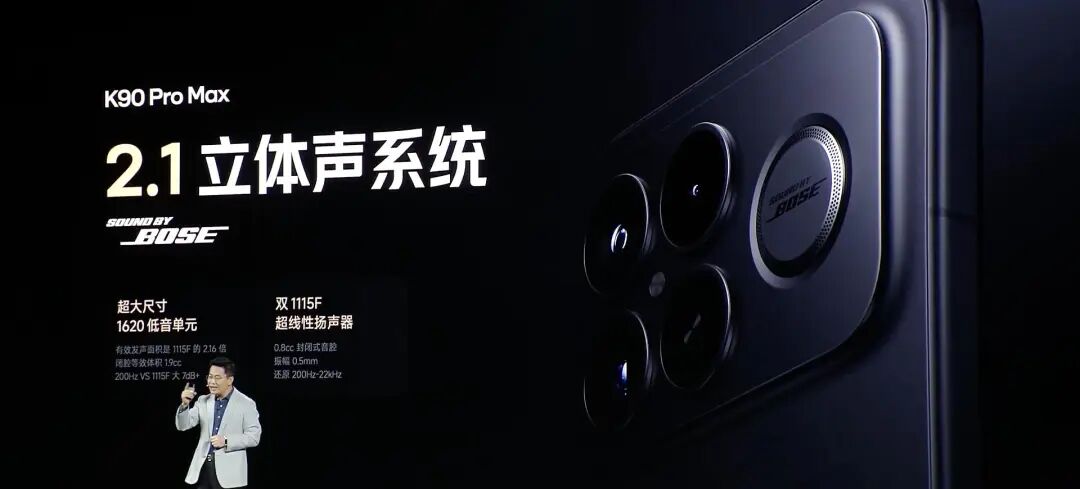音效方面:K90 Pro Max 采用 1115F 对称双扬声器,支持 2.1 立体声系统,由 Bose 联合调音,是 Redmi 系列迄今音质最好的机型。