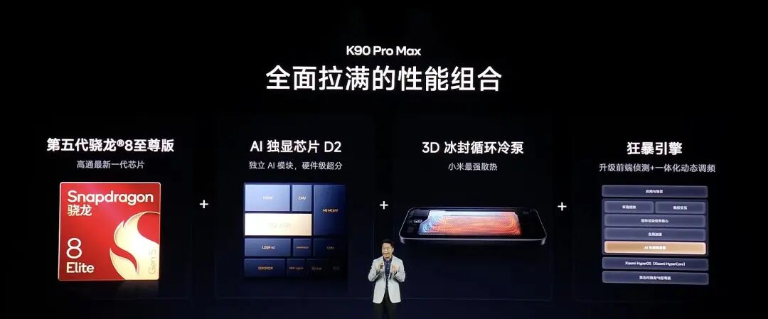 性能与散热:K90 Pro Max 搭载第五代骁龙 8 至尊版芯片,配合全新 AI 独显芯片 D2,AI 独显芯片 D2 支持硬件级超分算法,能在画质与功耗间实现动态平衡。散热方面,新机配备 6700mm² 小米最大 3D 冰封循环冷泵,在长时间游戏或高负载场景下可以保持强劲性能输出。