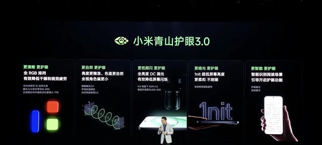 屏幕方面:K90 标准版采用 6.59 英寸 120Hz RGB OLED 直屏,支持全亮度 DC 调光与圆偏振光 2.0 技术,亮度可低至 1nit。这块屏幕使用 M10 发光材料,分辨率达到 2510×1156(419PPI),支持息屏显示、湿手触控 2.0 等功能。同时配备 小米青山护眼 3.0、环境色温感应与节律护眼模式,实现旗舰级护眼体验。