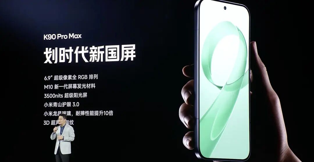 屏幕方面:K90 Pro Max 配备 6.9 英寸 120Hz RGB OLED 四等边直屏,采用 M10 发光材料,并延续小米旗舰同款 全 RGB 排列“超级像素屏”。屏幕支持 1nit 极暗光护眼、全亮度 DC 调光 与圆偏振光 2.0 技术,实现低亮度护眼与户外强光可视性兼得。还内置小米青山护眼 3.0 与环境色温自适应功能。这块屏幕不仅拥有旗舰级显示素质,也是 Redmi 有史以来最顶级的屏幕配置。